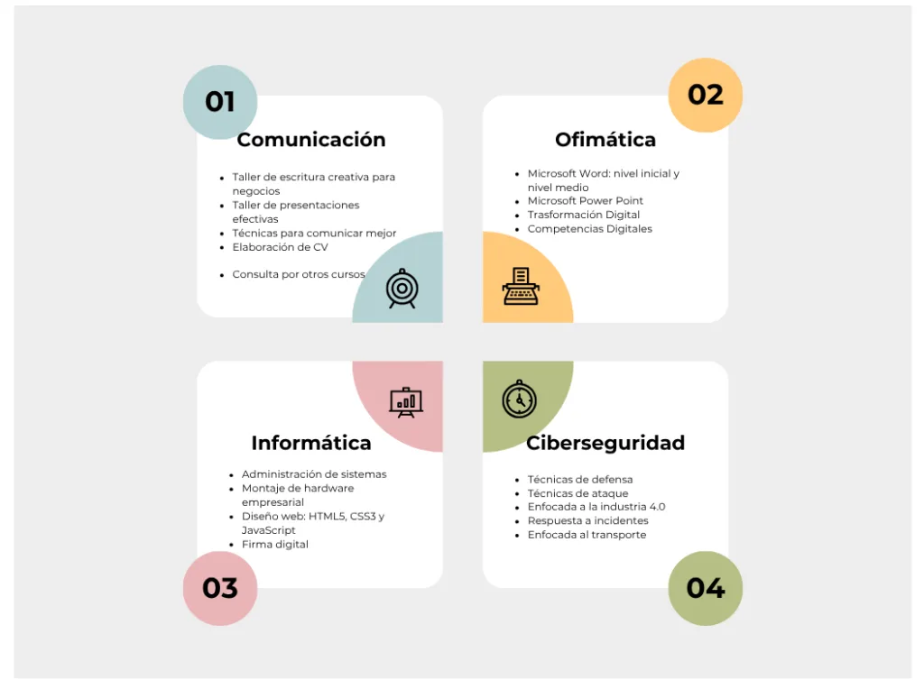 Creemos en el poder de la formación para transformar carreras y empresas. Por ello, ofrecemos cursos diseñados para diferentes niveles y necesidades: desde informática básica hasta ciberseguridad avanzada.